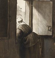Een dame in traditionele kleding, veel rokken, kijkt naar buiten terwijl ze binnen in huis is. Het zwartwit (zwart en wit) beeld is huiselijk en historisch.