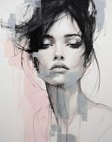 Een mix van aquarel en een lijntekening met hele dunne lijntjes van een prachtige vrouw met zwart haar. Een schoonheid pur sang. De kleurstelling is lichtroze, grijs, zwart en wit. Ook is gebruik gemaakt van paletmes technieken. Passend bij diverse stijlen en interieurs.