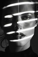 Dit betoverende zwart-wit portret speelt meesterlijk met licht en schaduw en benadrukt de sterke gelaatstrekken van een vrouw. De dramatische lijnen en felle lichtstralen die over het gezicht lopen, creëren een krachtig maar elegant beeld. Dit werk is ideaal voor liefhebbers van zwart-wit fotografie en moderne kunst en brengt een intense en stijlvolle sfeer in elke kamer.