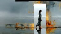 Dit mysterieuze schilderij toont een vrouw die door een surrealistische deur op een verlaten strand loopt. De scène is gehuld in een zachte mist, waardoor een droomachtige, bijna onwerkelijke sfeer ontstaat. De reflecterende oppervlakken - zowel op de vloer als op de deur - weerspiegelen het licht en versterken de mystieke sfeer. De…