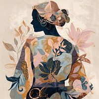 Vrouw met Bloemen | Abstracte Vrouw met Bloemenpatroon - Op dit abstract portret schilderij zie je een vrouw met een bloemig patroon dat haar silhouet omringt, wat een harmonieus en kleurrijk effect geeft met gouden accenten.