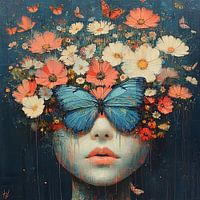 Vrouw met Bloemen Vlinders - Op dit vrouwen schilderij zie je een vrouwengezicht bedekt met een kleurrijke stoet van bloemen en vlinders bovenop haar hoofd, waarbij een grote blauwe vlinder prominent de plaats van haar ogen inneemt tegen een donkerblauwe achtergrond.