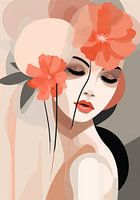 Vrouw met Bloemen - Een gestileerd digitaal portret met een moderne flair, het stelt een vrouwelijke figuur voor met grote, expressieve bloemen in het haar. De kleuren zijn zacht en harmonieus, met een opvallende verschijning van Peach Fuzz die de compositie verwarmt. Hoewel het palet beperkt is, zorgen de strakke lijnen en vlakken voor een gestructureerd en toch zacht geheel dat in veel hedendaagse interieurs past.