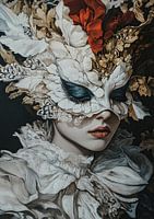 Vrouw met Bloemenmasker - Dit vrouwen schilderij toont een elegante dame wiens gezicht deels is bedekt met een weelderig masker van witte kant en veren, geflankeerd door grote rode en witte bloemen tegen een donkere achtergrond, waardoor een dramatisch en romantisch beeld ontstaat.