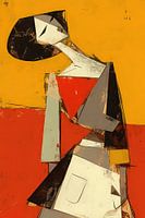 Details: abstract schilderij, vrouw schilderij, rode jurk, gele achtergrond, moderne kunst, geometrische vormen, zwart, wit, rood, geel