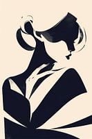 Vrouw met Elegante Pose - In dit vrouwen schilderij zie je een elegante vrouw met een stijlvol kapsel en een opvallende pose, waarbij de sterke contrasten tussen zwart en een lichte achtergrond de uitstraling van het portret benadrukken.