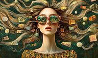 Vrouw met Golvend Haar - Op dit vrouwen schilderij zie je een jonge vrouw met een opvallende zonnebril, haar lange haren stromen als golven en om haar heen zweven diverse kleurrijke objecten.