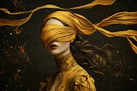 Vrouw met Goud - In dit vrouwen schilderij zie je een vrouw met een geel doek om haar hoofd, terwijl haar lange haar vrijvalt en de achtergrond donker is met gouden accenten.