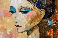 Vrouw met Gouden Achtergrond - In dit vrouwen schilderij zie je een vrouw met opvallende blauwe ogen en een gezicht dat lijkt te stralen door verschillende zachte kleuren, en de abstracte achtergrond geeft een moderne en artistieke sfeer.