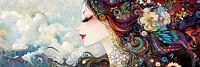 Vrouw met Grote Ogen - Op dit vrouwen schilderij zie je een elegant meisje met grote ogen en kleurrijk, golvend haar vol bloemen en een vlinder, tegen een zachte, blauwachtige achtergrond.