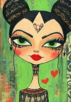 Details: vrouwen schilderij, meisje schilderij, grote ogen, kleurrijk, groen, hart, sieraad, moderne kunst, portret, speels