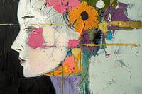 Vrouw met Kleurrijke Bloem - Op dit vrouwen schilderij zie je een vrouw met een opvallende zonnebloem in haar haar, omringd door moderne abstracte kleuren en vormen, die een frisse en levendige uitstraling geven aan het kunstwerk.