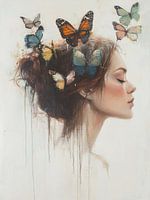 Vrouw met Kleurrijke Vlinders - Dit is een vrouwen schilderij van een vrouw met een dromerige uitstraling, omringd door kleurrijke vlinders die haar hoofd siert, en het geheel straalt een luchtige en moderne sfeer uit.