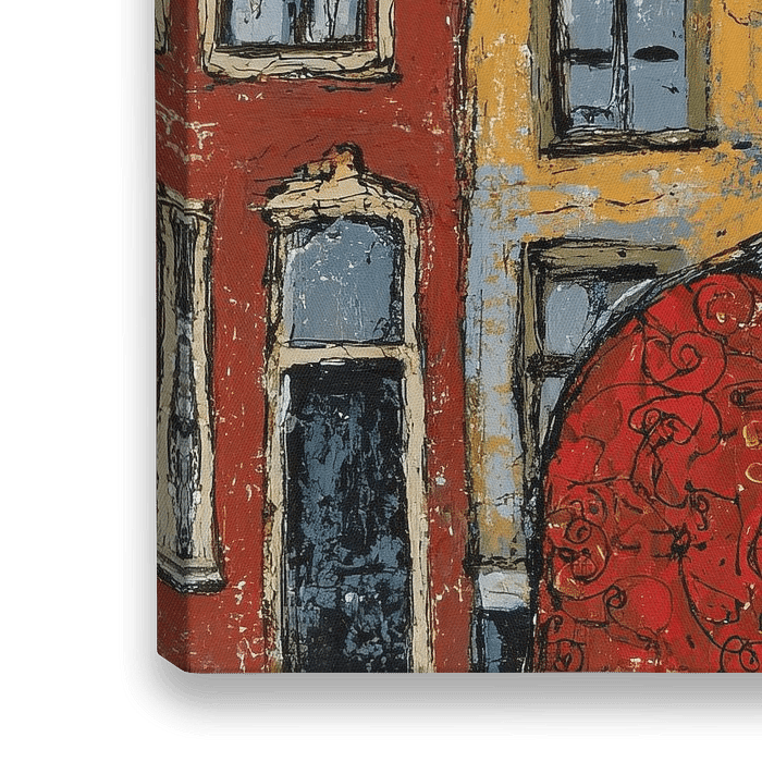 Vrouw met Krullend Haar - Op dit vrouwen schilderij zie je een vrouw met krullend haar en een rode jurk, geflankeerd door een kleurrijke achtergron van gebouwen in verschillende tinten, wat een levendige en artistieke sfeer oproept.