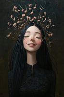 Vrouw met Noten - Op dit vrouwen schilderij zie je een vrouw met lange zwarte haren die serene vreugde uitdrukt, terwijl muzikale noten boven haar hoofd zweven, wat een gevoel van creativiteit en muziek oproept.