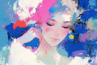 Vrouw met Oorbel | Stijlvolle Vrouw met Kleuren - Op dit vrouwen schilderij zie je een vrouw met een stijlvolle oorbel, haar hoofd naar beneden gekanteld in een dynamische compositie van levendige kleuren zoals roze, blauw en wit, wat een gevoel van rust en zelfreflectie oproept.