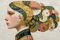 Vrouw met Oorbel - Op dit vrouwen schilderij zie je een elegante vrouw met een opvallend gouden oorbel en een prachtig, kleurrijk haardecor met bloemen en ornamenten, dat een moderne stijl uitstraalt.