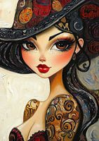 Details: vrouwen schilderij, schilderij vrouw, hoed, grote ogen, rode lippenstift, zwart haar,…