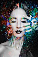 Vrouw, verf, spetters, abstract, meerkleurig, portret, sexy, mooi, blauw, rood, oranje, groen, schilderij, kunst, lippenstift, wimpers, zwart
