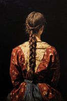 Een meer klassiek en realistisch portret waarin licht en schaduw centraal staan. De donkere achtergrond zorgt ervoor dat de figuur sterk naar voren komt, terwijl de verfstructuur zichtbaar blijft en het werk levendig maakt. De vlecht en de rijke stoffen geven het beeld een ambachtelijke en bijna historische uitstraling. Een werk met…
