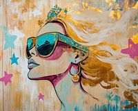 Details: vrouwenportret, moderne kunst, zonnebril, sterren, gouden haar, spontaniteit,…