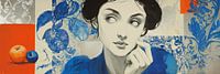 Vrouw met appel - Dit vrouw schilderij toont een sterke en expressieve vrouw met een blauwe blouse, terwijl op de voorgrond een opvallende oranje appel en een blauwe bes liggen, wat een speelse en moderne uitstraling geeft.