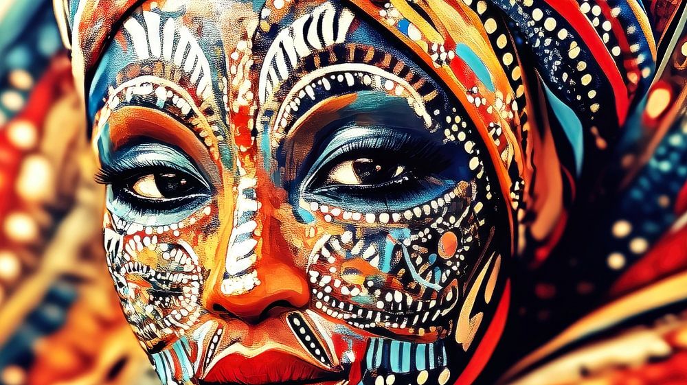 Dit expressieve portret toont een vrouw met heldere, artistieke gezichtsbeschildering die haar schoonheid benadrukt in intense kleuren en fijne patronen. Haar bijpassende hoofddoek vormt een harmonieuze aanvulling op het ontwerp en versterkt de culturele diepte van de afbeelding. De illustratie is een eerbetoon aan de Afrikaanse cultuur en esthetiek, gecombineerd met een moderne, artistieke interpretatie.
