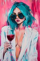 Een zelfverzekerde vrouw straalt glamour en vrijheid uit in een levendig samenspel van gedurfde roze en blauwe tinten. Haar stijlvolle zonnebril en de rode wijn in haar hand benadrukken een ontspannen, modieuze sfeer. Dit kunstwerk is ideaal voor een trendy woonkamer, geeft elke kamer een fluwelen elegantie en nodigt uit om te dromen.