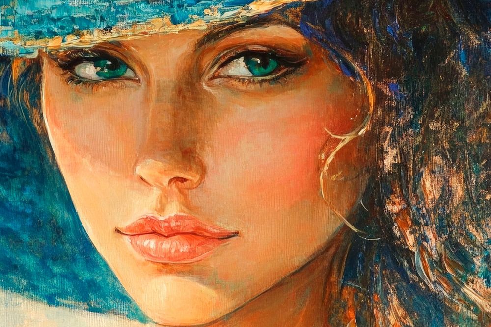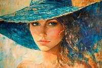 Een fascinerend portret van een vrouw met sprankelende ogen en een te grote blauwe hoed die meteen in het oog springt. De levendige kleuren en zachte penseelstreken stralen een warme, uitnodigende sfeer uit. Ideaal voor de slaapkamer of woonkamer, waar het een vleugje elegantie en zomerse flair toevoegt.