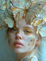 Blanke huid vrouw met witte vlinders in haar hoofd, wit en goud elegant portret