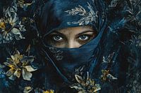 Dit bijzondere ontwerp combineert een betoverend portret van een vrouw met intense, doordringende ogen en delicate bloemen die subtiel verweven zijn in de achtergrond. Haar gezicht is deels verborgen achter een blauwe doek, wat een sfeer van mysterie en kracht creëert. De bloemen, uitgevoerd in zachte tinten van goud en wit, voegen een verfijnde natuurlijke touch toe aan het geheel. De artistieke stijl en het samenspel van kleuren maken dit ontwerp tot een intrigerend kunstwerk dat een ruimte meteen een unieke en elegante uitstraling geeft. Ideaal voor wie op zoek is naar een stuk met zowel diepgang als schoonheid.