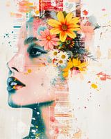 Dit portret toont een vrouw met gesloten ogen in zijaanzicht. Haar gezicht is rustig, de ogen zijn ontspannen, de lippen gesloten. Rond haar hoofd ontvouwt zich een explosie van transparante kleurvlakken, bloemen en abstracte elementen. De vormen lopen in elkaar over en creëren een gevoel van beweging en vervaging. Grote bloemen, zoals een roze dahlia en abstracte bladvormen, zweven als het ware door haar haar.