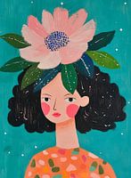 Schilderij van een vrouw met groot, donker krullend haar en bloemen in haar haar. Het is een handgeschilderde gouache waarin de vrouw een roze bloem op haar hoofd houdt. De achtergrond is turkoois met kleine witte stippen, wat een dromerige sfeer creëert. Het kleurpalet is zacht en vrouwelijk, met tinten roze, rood, groen en blauw. De…