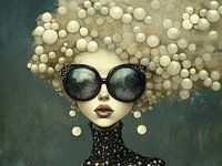 Vrouw met bolletjeshaar - In dit vrouwen schilderij zie je een vrouw met opvallende ronde zonnebrillen en een bijzondere, volumineuze haardos die lijkt op kleine bolletjes, elk in zachte kleuren op een rustige achtergrond.