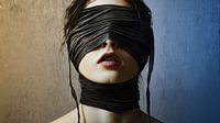 Een geblinddoekte vrouw staat stil en straalt een serieuze, bedachtzame houding uit. Haar gezichtsuitdrukking straalt een mengeling van kracht en onzekerheid uit, alsof ze haar innerlijke vastberadenheid behoudt ondanks de duisternis die haar omringt. De achtergrond is groezelig en hard, wat bijdraagt aan de intensiteit van de scène en…