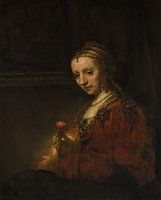 Het dragen van een romantisch verouderd kostuum en exotische sieraden, de vrouw houdt een roze of anjer, het symbool van liefde en huwelijk.