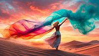 Vrouw met gekleurde zijde in de woestijn met zonsondergang