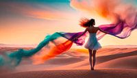 Vrouw met gekleurde zijde in de woestijn met zonsondergang