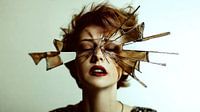 Dit surrealistische portret toont een vrouw met gesloten ogen wiens gezicht bedekt is met gebroken glasscherven. De scherven reflecteren het licht en creëren een spannende wisselwerking tussen breekbaarheid en kracht. De gesloten ogen versterken het gevoel van innerlijke contemplatie en emotionele diepte, terwijl de scherven een symbolische barrière vormen tussen de binnen- en buitenwereld van de vrouw.