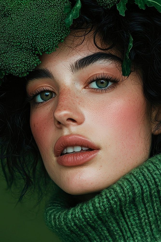 In zachte groentinten straalt dit creatieve portret een gevoel van frisheid en nabijheid tot de natuur uit. Het weelderige haarornament met bladeren harmonieert perfect met de gebreide trui en geeft het tafereel een levendig, organisch tintje. Ideaal om een ontspannen sfeer te creëren in de woonkamer of als inspirerend element op kantoor.