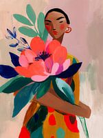Dit kunstwerk toont een krachtige vrouw die een enorme, felgekleurde bloem vasthoudt. De bloem bestaat uit intense tinten roze, rood en blauw, omlijst door diepe groene bladeren die de compositie stevigheid geven. Haar gezicht is sereen maar ook vastberaden, met rode accenten op de wangen en een rustige blik die kracht en elegantie…