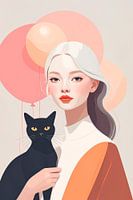Een illustratie van een blonde moderne vrouw, met in haar armen een zwarte kat. Achter de vrouw zweven pastelkleurige ballonnen in oranje en roze tinten. Ook haar lippen zijn oranje en haar kleding is wit met oranje. Een zacht en lieflijk portret. Het beeld is met behulp van ai gegenereerd.
