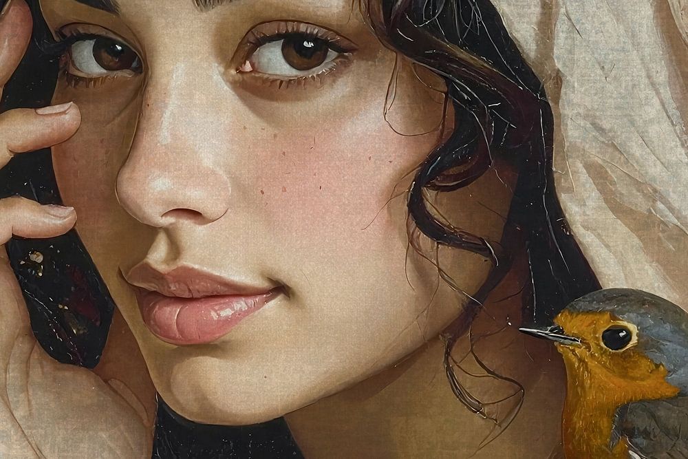 Kernwoorden: portret, vrouw, roodborstje, vogel, vingtage, retro, warme kleuren, aarde tint