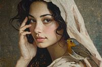 Een vrouw met donkere krullende haren, bruine ogen en een beige hoofddoek, ze heeft een roodborstje op haar schouder. Fijne details met veel diepte en warme kleuren.