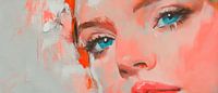 De blik van een fascinerende vrouw schittert in zachte pastelkleuren, haar helderblauwe ogen boeien de kijker. Delicate accenten van oranje geven het portret levendigheid en warmte. Dit artistieke werk is ideaal voor een woonkamer, waar het gesprekken stimuleert en een uitnodigende sfeer creëert.