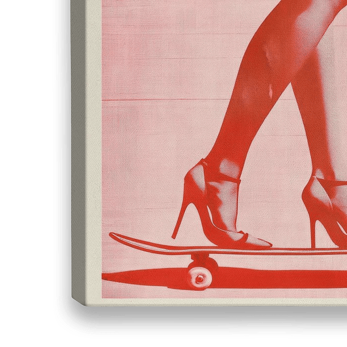 Poster ontwerp van vrouw op hoge hakken op een skateboard uitgevoerd in roze.