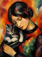 Het klassieke schilderij toont een vrouw met haar zwart-witte kitten in haar armen. De achtergrond is in felle, heldere kleuren zoals rood, oranje, groen en blauw, geschilderd in een kubistische en expressieve stijl. De vrouw en de kitten zien er erg ontspannen uit. De donkere, intense kleuren en de expressionistische stijl van het schilderij, geïnspireerd door Franz Marc bijvoorbeeld, geven het tegelijkertijd een ontspannen en dynamische, levendige sfeer. Het kunstwerk ziet er zowel traditioneel als modern uit. Precies goed voor je woonkamer.
