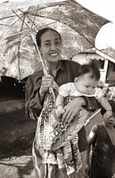 Moeder en baby. Moeder beschermt haar baby met een paraplu. Indonesië / Sumatra. De opname is gemaakt met analoge film!