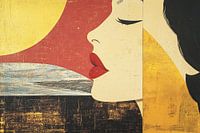 Vrouw met kleur | Geel en rood gezicht met vrouw - In dit vrouwen schilderij zie je een vrouw met opvallende rode lippen en lange zwarte haren, tegen een achtergrond van felle kleuren zoals geel en rood, met abstracte vormen die de aandacht trekken.