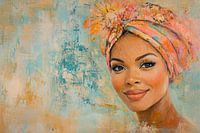 Dit schilderij toont een prachtig portret van een vrouw met een kleurrijke hoofddoek tegen een abstracte, warme achtergrond. Het kleurgebruik en de gedetailleerde penseelstreken geven het werk een levendige uitstraling. De uitdrukking van de vrouw is zacht en vriendelijk, wat een gevoel van rust en vreugde uitstraalt. De combinatie van realistische elementen met een abstracte achtergrond maakt dit kunstwerk veelzijdig en aantrekkelijk voor elke ruimte. Dit kunstwerk zou een prachtige toevoeging zijn in een woonkamer, kantoor of slaapkamer, en het brengt een vleugje kleur en elegantie in elke omgeving.